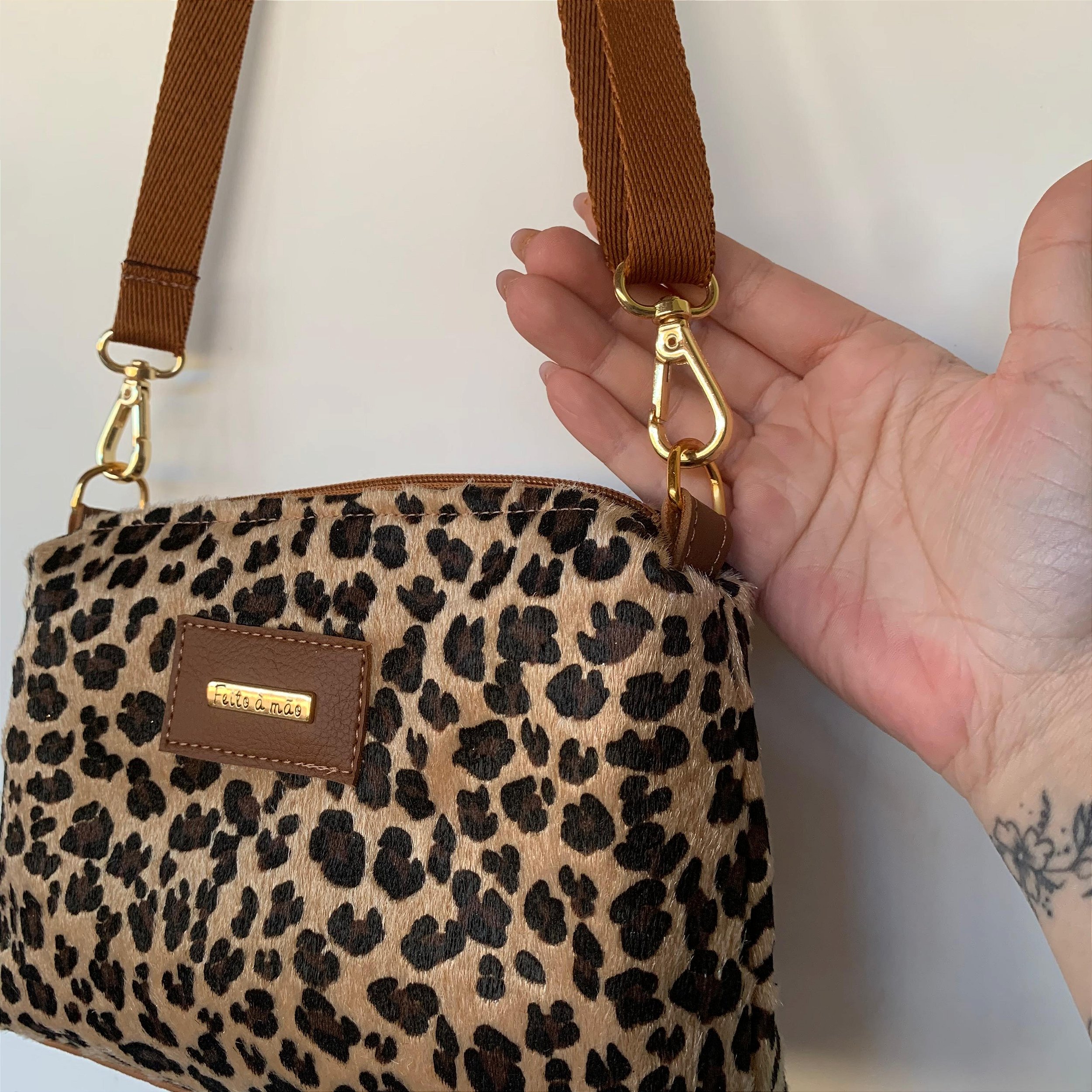 Bolsa Basiquinha no formato retangular, bolsinho interno e fecho em zíper. Feita com material sintético de oncinha, levemente peluciado Tamanho: 15 cm altura x 22 cm comprimento x 6 cm de profundidade