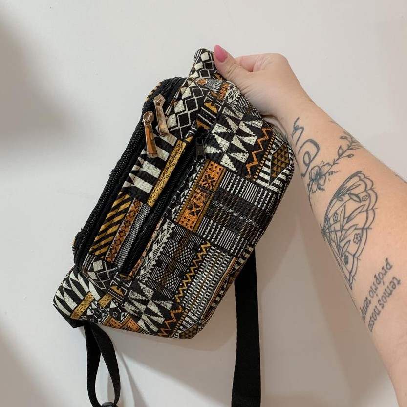 Pode ser usada na cintura ou na lateral, com fecho clássico de pochete. Bolso central e um bolsinho frontal ótimo para cartão ou documento. Possui bolso anti-furto para celular.