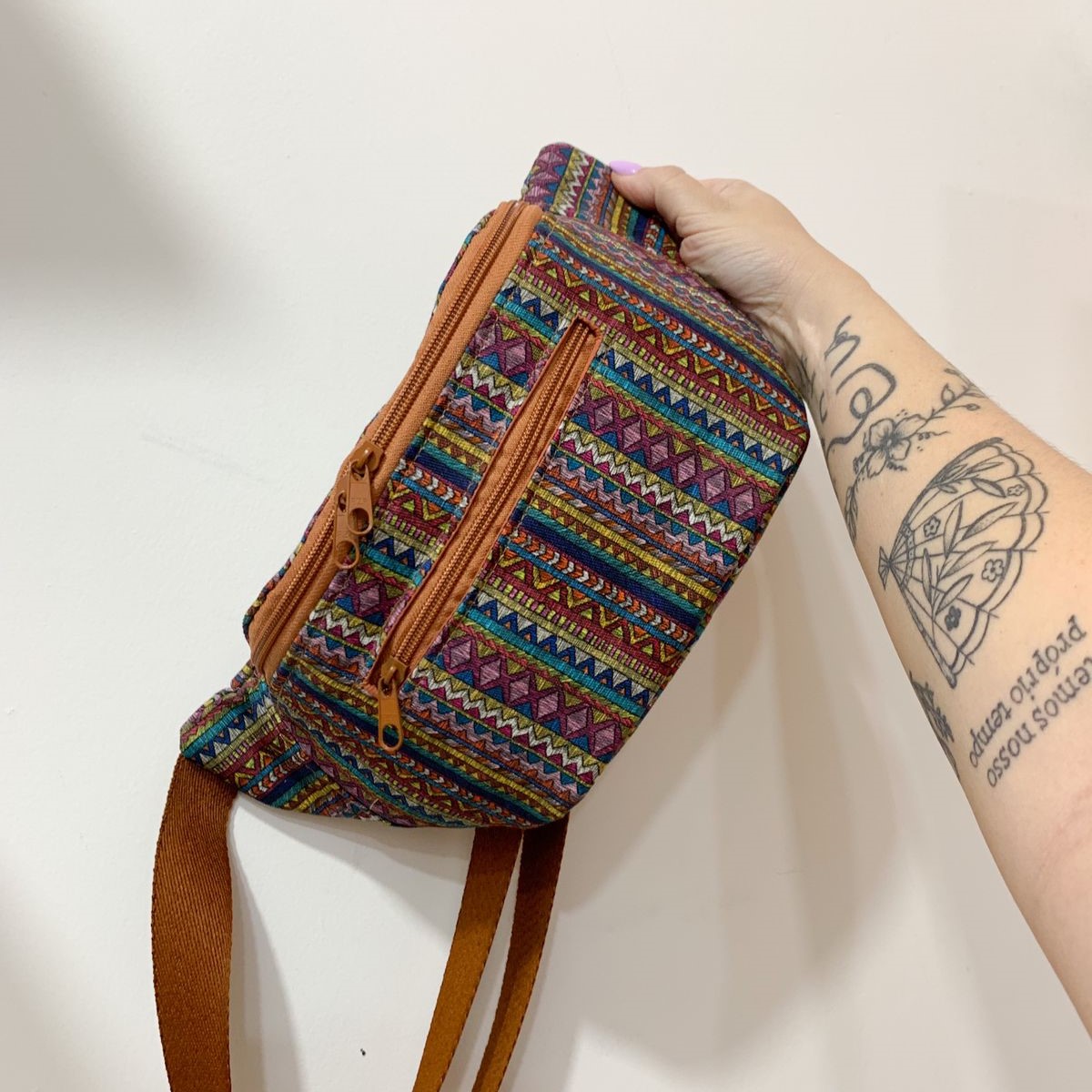 Pode ser usada na cintura ou na lateral, com fecho clássico de pochete. Bolso central e um bolsinho frontal ótimo para cartão ou documento. Possui bolso anti-furto para celular.