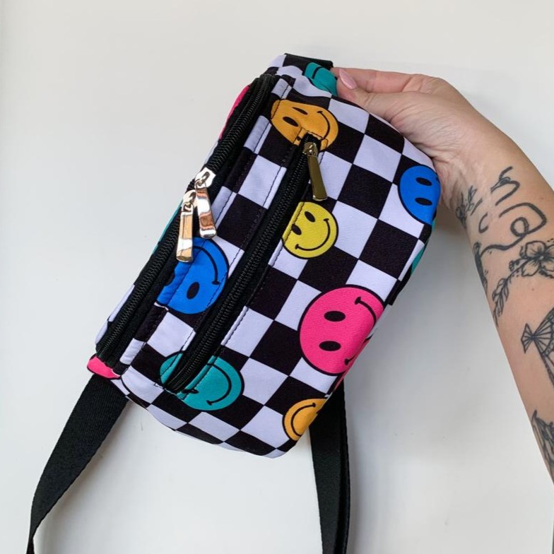 Pode ser usada na cintura ou na lateral, com fecho clássico de pochete. Bolso central e um bolsinho frontal ótimo para cartão ou documento. Possui bolso anti-furto para celular.