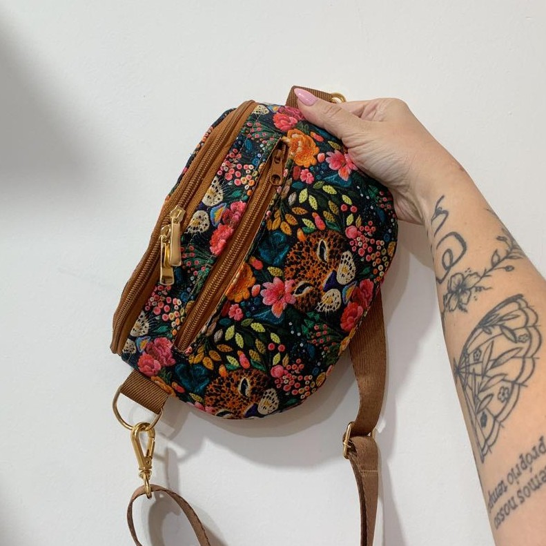Pode ser usada na cintura ou na lateral, com fecho de mosquetão. Bolso central e um bolsinho frontal ótimo para cartão ou documento.